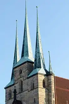 St Severus' Church (German: Severikirche) in the city of Erfurt in Thuringia, Germany, is a Roman Catholic church building. It stands on the Domberg (Cathedral Hill) directly next to St Mary's Cathedral. As a unique architectural ensemble, both churches together form the city's landmark. Due to its unusual form, which seems to anticipate the late Gothic hall church, St Severus' Church is one of the most important Gothic buildings in Germany. The bones of the church patron Severus of Ravenna rest in an artistically very significant sarcophagus.