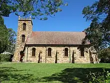 St. Stephen's Church has a simple rectangular plan with a square-based tower incorporating the entry to the building at its eastern end and a small attached vestry at the western end. It construction employed coursed sandstone rubble with dressed quoining and weathering to buttresses and the tower's battlemented parapet. Openings feature simple label-moulded semi-circular heads. Internally, finishes and furniture are of local cedar. The building's substantial trussed gable-ended roof with elegant barge decoration has undergone replacement of its original shingle cladding with Marseilles tiles.[9][1]