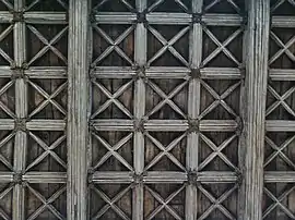 Jenkins describes the church as having "... the finest roof in Lancashire, worthy of Somerset's best. This is a Tudor work of panels and cross-braces covering nave, aisles and, most elaborate, the chancel. The vicar has studied the bosses and claims that no two are the same".[14] The pew ends in the Standish family chapel display the family crest of an owl with a rat.[14]