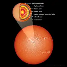 When helium is exhausted at the core of a massive star, the core contracts and the temperature and pressure rises enough to fuse carbon (see Carbon-burning process). This process continues, with the successive stages being fueled by neon (see neon-burning process), oxygen (see oxygen-burning process), and silicon (see silicon-burning process). Near the end of the star's life, fusion continues along a series of onion-layer shells within a massive star. Each shell fuses a different element, with the outermost shell fusing hydrogen; the next shell fusing helium, and so forth.[91]