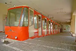Funicular car (1960s Ceretti-Tanfani model) at the terminus of Starý Smokovec