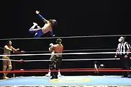 Star Boy Jr. began working for Consejo Mundial de Lucha Libre (CMLL) in early 2014, making his CMLL debut on January 6, 2014 under the shortened ring name "Star Jr." teaming up with Robin and Meyer to defeat El Rebelde, Espíritu Maligno and King Jaguar.[9] In CMLL Star Jr. received further training from one of CMLL's resident trainers Franco Colombo, helping him gain further experience and adjust to CMLL's working environment.[1] Star Jr. was one of 14 "rookies" entered in the 2014 Torneo Gran Alternativa ("The Great Alternative tournament"), an annual tournament in CMLL where a rookie is teamed up with a veteran wrestler for a tag team tournament. Star Jr. competed in Block B of the tournament, teaming with veteran Atlantis on February 7, 2014. The block began with a battle royal elimination match to determine the other of the actual tag team matches. Star Jr. and El Rebelde outlasted the other rookies in the block, Black Panther, Canelo Casas, Cavernario, Dragon Lee, Espiritu Negro, Hechicero and Herodes Jr. In the actual tournament Star Jr. and Atlantis lost to El Rebelde and Averno in the first round.[10] In March Star Jr. entered that year's En Busca de un Ídolo ("In search of an idol") tournament, a tournament designed to feature the younger wrestlers in CMLL, identifying one wrestler who is ready to move up the ranks of CMLL. Wrestlers would compete against each other in weekly matches and get points for the ring results, from a panel of judges and a weekly online poll.[11][12] The tournament started with 16 wrestlers competing for the eight spots in the tournament in a torneo cibernetico elimination match; Star Jr. along with Cachorro, Cavernario, Dragon Lee, Guerrero Negro Jr., Hechicero, Soberano Jr. and Super Halcón Jr. qualified for the tournament while Black Panther, Canelo Casas, El Rebelde, Espiritu Negro, Flyer, Herodes Jr., Metálico and Oro Jr. were eliminated from the tournament.[13] As part of the tournament Star Jr. was assigned Virus as a trainer who helped guide him through the matches from week to week.[13] The first round of the tournament ran from April 1 through the end of May with one match per week for each wrestler. In the tournament Star Jr. defeated Dragon Lee, Guerrero Negro Jr. and Soberano Jr. but lost the remaining four matches. He ended the first round in fifth place, with 406 points, 17 points behind Dragon Lee and was eliminated from the tournament. Star Jr. began teaming regularly with former En Busca de un Ídolo rival Soberano Jr. to form a tag team that soon took the nickname Los Principes del Ring ("The Princes of the Ring").[14] In late 2014 Los Principes del Ring began a storyline feud with the team of veteran wrestlers Cholo and Ramstein with the main theme being that the veterans felt that Star Jr. and Soberano Jr. were disrespectful to the more experienced Cholo and Ramstein and wanted to teach the "brats" their proper place in CMLL. On December 30, 2014 the four men signed a contract to risk their masks in a Luchas de Apuestas, or bet match, to take place on January 6, 2015.[14] In Lucha Libre winning an opponent's mask is considered the "ultimate prize".[3] On January 6 Star Jr. and Soberano Jr. defeated Cholo and Ramstein in a two out of three falls match, forcing both of their opponents to unmask in front of the Arena México while revealing their real names.[15][16] On April 7, 2015 Star Jr. broke the middle finger on his right had during a match where Star Jr and Soberano Jr. teamed up with Oro Jr., losing to Cancerbero, Raziel and Sangre Azteca.[17] The injury would keep him out of the ring for 3 months. During his return it was revealed that the team of Star Jr. and Soberano was now officially called Los Principes Azules ("The Blue Princes") by CMLL.[17] In his return on July 7, 2015 the team of Star Jr. Leono and Stigman defeated Cancerbero, Raziel and Metálico.[18] In late October 2017, Star Jr. was announced to make his debut in Japan by participating in Fantastica Mania 2018, an eight night tour co-promoted by New Japan Pro-Wrestling.