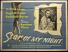 Star of My Night is a 1954 British romance film directed by Paul Dickson and starring Griffith Jones, Kathleen Byron and Hugh Williams.[1] An adaptation of Paul Tabori's novel Le Soleil de ma Nuit, it concerns a sculptor who becomes romantically involved with a ballerina. It was produced as a second feature by the Danziger Brothers, although it had a more established cast than many.[2]