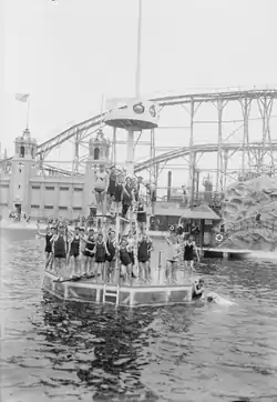 The rebranded Starlight Park opened in 1920. Throughout that year Starlight Park's operators added several attractions and concessions, including shooting galleries, games of chance, and a dark ride through an exhibit of "grottos and other worldly sights".[8] The park continued to add attractions and events for the 1921 season, including a baseball field, several shows, and a kid's club.[9] Further additions in 1922 included a sound system by the pool area; a program of movies broadcast from a projector; and rides such as electric riding cars, the Gyroplane, and the Maelstrom. Numerous promotional events were also held that year, including a Film Players Club fundraiser, a singing contest, and a "Surprise Week" featuring a different performance each day of the week.[10]
