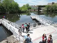 Current recreational facilities in Starlight Park include four baseball fields (two made of grass and two of asphalt), as well as five checkers tables and eight handball courts.[29] A soccer field overlaps with two of the baseball fields, and a basketball court and playground are located south of the 174th Street bridge over the park.[45] A seasonal canoe launch is located in the park as well.[46] During the summer, the Bronx River Alliance operates a canoeing program called Community Paddle; the program charges a fee on Saturdays but is free on Fridays.[42] Plans for the park, announced in 2017, call for a waterfront greenway, as well as the opening of the parkland on the eastern bank of the Bronx River.[33]