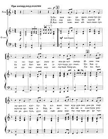 The state anthem of the Sakha Republic[lower-alpha 1] is the regional anthem of the Sakha Republic, a federal subject of Russia. It is one of the official symbols of the Sakha Republic, along with the flag and the coat of arms of the Sakha Republic. It was originally written in the Yakut language by Savva Tarasov and Mikhail Timofeyev. The anthem was translated into Russian by Vladimir Fedorov. The music was composed by Kirill Gerasimov. It was officially adopted on 15 July 2004. The anthem's music is played in F major.[3]
