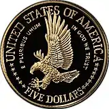 The obverse of the Statue of Liberty half eagle (five dollars) features a close-up view of the Statue of Liberty's face, while the reverse depicts a bald eagle in flight.[7] Both sides were designed by Elizabeth Jones.[8]