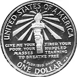 The obverse of the Statue of Liberty dollar, designed by John Mercanti, features the Statue of Liberty in front of the main building of Ellis Island. The reverse, also designed by Mercanti but with assistance from Matthew Peloso, features the statue's torch and a quote from Emma Lazarus' 1883 poem The New Colossus.[2][6]