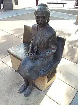 Pete Helzer's statue depicting Rosa Parks sitting in a bus seat was unveiled on Martin Luther King, Jr. Day in 2009, the same day Lane Transit District's Eugene Station Plaza was renamed Rosa Parks Plaza, making Eugene the first U.S. city to dedicate a bus station in Parks' honor.[1][2] The sculpture cost $44,000; the first $10,000 was contributed by Lane Transit District and the remainder was raised from local businesses, civic organizations, community members, and government agencies.[1][2] Helzer said of the project, "This one had so much attached to it in terms of community interest and community support and it feels good."[2]