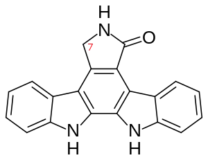 Staurosporine (antibiotic AM-2282 or STS) is a natural product originally isolated in 1977 from the bacterium Streptomyces staurosporeus.[1] It was the first of over 50 alkaloids to be isolated with this type of bis-indole chemical structure. The chemical structure of staurosporine was elucidated by X-ray analysis of a single crystal and the absolute stereochemical configuration by the same method in 1994.[2]