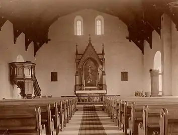 One new church would be built on the island of Helgøya and the other would be built in Stavsjø. In 1870, the new Helgøya Church was completed. After that, work began on the new Stavsjø Church. The building permit was issued in 1874, but due to financial problems, the church was not completed for several years. On 3 March 1878, the old Baldishol Church was torn down. The new Stavsjø Church was completed in 1880, being consecrated on 15 September 1880. Initially, there was some confusion over the name of the new church. The names Jevne, Penningrud, and Stavsjø were all used initially used since all three were local names of the farms in the area. It wasn't until 1911, that the church was officially named Stavsjø Church.[5][3][4]