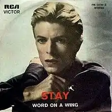 On 3 January 1976, Bowie and his band appeared on the Dinah Shore-hosted variety show Dinah! where they performed "Stay",[17] marking the song's public debut.[18] Writer Rob Sheffield calls the performance the debut of Bowie's character the Thin White Duke and further noted Bowie's dancing while on stage.[17] Compared to other appearances on television during this period, particularly when he performed "Golden Years" on Soul Train,[19] Bowie was more relaxed and coherent during his Dinah! interview.[17] RCA issued Station to Station later that month on 23 January, with "Stay" sequenced as the second track on side two of the original LP,[20] between "TVC 15" and Bowie's cover of "Wild Is the Wind".[21] In July, the full-length six minute album version of "Stay" appeared as the B-side of the "Suffragette City" single,[10] which was issued to promote the Changesonebowie compilation. It failed to chart.[22] "Stay" was then issued as an A-side in the US the same month in heavily edited form—running 3:21—with the catalogue number PB 10736 and fellow album track "Word on a Wing" as the B-side. It failed to chart.[23]