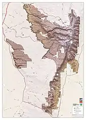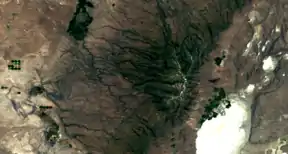 Steens Mountain is in the southeastern part of the U.S. state of Oregon, and is a large fault-block mountain.[2][3] Located in Harney County, it stretches some 50 miles (80 km) north to south, and rises from the west side the Alvord Desert at elevation of about 4,200 feet (1,300 m) to a summit elevation of 9,738 feet (2,968 m). Steens Mountain is not part of a mountain range but is properly a single mountain, the largest of Oregon's fault-block mountains.[4][5]