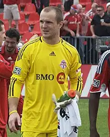 In January 2011, newly hired coach Aron Winter stated in an interview that Julian De Guzman, Dwayne De Rosario and Stefan would be the key players of the upcoming season and he was impressed with Frei's abilities.[10] Frei recorded his first clean sheet of the 2011 season in the second game of the year in a 2–0 home victory over Portland Timbers on 26 March. Frei also earned his third assist since playing with Toronto setting up the second goal for Javier Martina; it was later awarded the Goal of the Week in MLS.[11][12] Following the departure of Toronto captain Dwayne De Rosario in early April, Coach Winter named Maicon Santos as the replacement captain while Frei would become vice captain. On 13 April against Los Angeles Galaxy, Frei wore the captain's armband for the first time with Toronto due to an injury to Santos; the game ended in a 0–0 home draw.[13] Frei started most games in the first half of 2011 but faced some injuries; after resting a few games, backup keeper Miloš Kocić strung together several strong performances, creating a highly competitive environment at the position. At the end of the season it was announced that Frei would be training with Liverpool, and return to Toronto before pre-season training.[14][15]