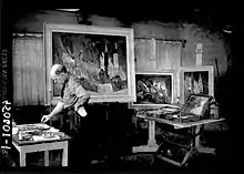 Stefan Hirsch shown working on several drafts of his painting, The Bombing of Nuremberg, 1947. The completed canvas now hangs in the president's office, Bard College.