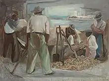 Hirsch's social realist style can be seen in Construction of Roosevelt Highway of about 1930 shows five dark-skinned laborers, none facing the viewer, all having postures showing resignation or despondence. Industrial buildings spewing smoke and a set of grain elevators appear in the background.