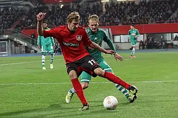 After arriving in Leverkusen, he netted eight goals in the 2006–07 season,[15] 16 goals in the 2007–08 season,[16] and 14 goals in the 2008–09 season.[17] On 5 April 2009, he scored his side's first goal in a 2–0 win over 1. FC Köln, keeping alive Leverkusen's chances of qualifying for Europe for the following season.[18] Leverkusen trailed off following the win, eventually falling to ninth place in the final Bundesliga standings.[19]