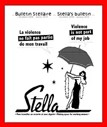 Stella, l’amie de Maimie is the only community group in Montreal that works exclusively and specifically with sex workers. Founded in 1995, this "by and for" community organization has the goal of improving the life and work conditions of all women-identified sex workers in Montreal. Their programs promote good health practices and respect for the human rights of sex workers. The organization encourages empowerment and solidarity by and amongst sex workers, which means that all its actions favor the individual and collective responsibility of these sex workers.[2] Stella serves all kinds of sex workers and maintains an ongoing presence in sex work venues, including streets, escort agencies, massage parlors and strip bars.