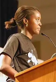 Stephanie Nyombayire introducing Bill Clinton at the 2005 Campus Progress National Student Conference on behalf of the Genocide Intervention Network.