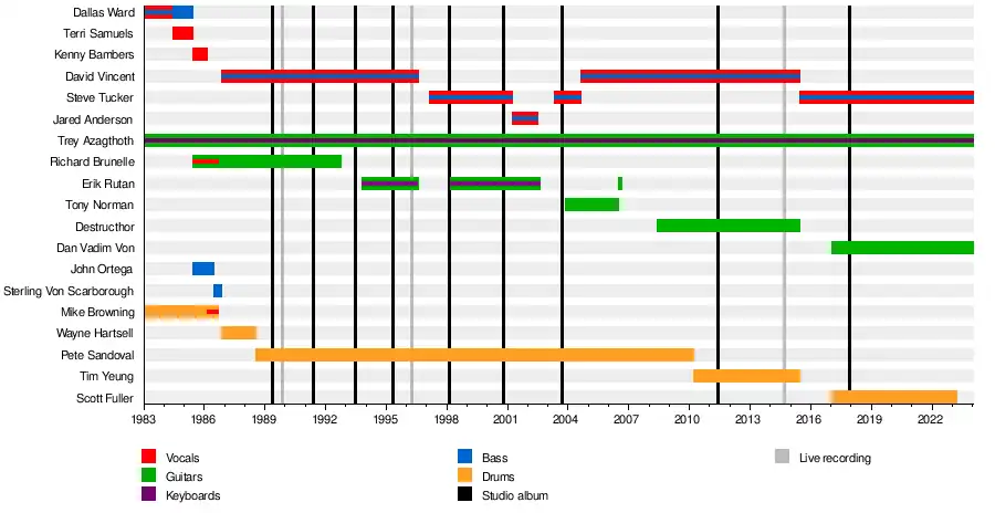 Shortly after the recording of Abominations of Desolation, Ortega was replaced with Sterling Von Scarborough, and after one more show Browning was fired following a fight with Azagthoth.[2] He was replaced by drummer Wayne Hartsell and vocalist Michael Manson, although after a short time both Scarborough and Manson departed, leaving producer David Vincent to take over as bassist and vocalist.[1] After another demo, Thy Kingdom Come, former Terrorizer drummer Pete Sandoval replaced Hartsell in July 1988.[3] This lineup released Altars of Madness and Blessed Are the Sick.[4]