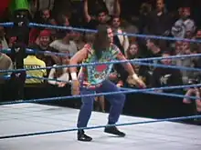 During the opening of Holiday Hell on December 29, 1995, Richards received a kiss from Missy Hyatt, who was seated at ringside, after claiming he could get her "a date with Raven" in return. Later that evening, Richards and The Blue Meanie were squashed by Dreamer in consecutive matches. Dreamer went on to face Raven, who defeated him yet again after repeated interference from Richard and The Blue Meanie.[24] At House Party on January 5, 1996, Richards attempted to kiss McGillicutty, who refused, eventually announcing that she was pregnant. After Raven angrily confronted McGillicutty, she informed him that he was not the father, causing Raven to attack Richards. McGillicutty then revealed that Tommy Dreamer was the father, with Dreamer storming the ring and beating down Raven, Richards and The Blue Meanie.[25] On February 3, 1996, at Big Apple Blizzard Blast, Richards announced that he was suing Missy Hyatt—who had aligned herself with The Sandman—for sexual harassment (a reference to Hyatt's lawsuit against her former employer, World Championship Wrestling).[26] On June 1, 1996, at Fight the Power he served Hyatt by stuffing a summons into her cleavage.[27][28] The angle concluded at Natural Born Killaz on August 24, 1996, when Richards offered to drop the lawsuit if Hyatt would insult The Sandman. After Hyatt complied, The Sandman caned her, breaking their alliance.