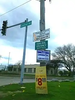 Township offices are located at 5635 W. State Road in Burbank. Other municipalities in the township include Stickney (pop. 7,110)[4] and Forest View (pop. 792),[5] and the largely industrial eastern half of Bedford Park, as well as some small portions of Bridgeview. The unincorporated communities of Central Stickney and Nottingham Park are also within the township. Stickney Township's approximate borders are Pershing Road (39th Street) on the north, Cicero Avenue on the east, 87th Street on the south, and Harlem Avenue on the west, excepting those areas in the Chicago communities of Garfield Ridge and Clearing (which include Chicago Midway International Airport), but also including the area between Laramie and Cicero Avenues as far north as 35th Street, where Hawthorne Race Course is located. The Chicago Sanitary and Ship Canal, designated a National Historic District in 2011, passes through the northwest corner of the township.