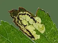 The larvae feed on Midland hawthorn (Crataegus laevigata), common hawthorn (Crataegus monogyna) and medlar (Mespilus germanica). They mine the leaves of their host plant, which begins as a corridor that usually follows the leaf margin. After a moult, an elongated blotch is found, generally the direction of this blotch is opposite to that of the corridor.[2]