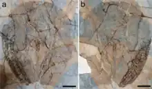 Full-body stingray fossils are very rare but are known from certain lagerstätte that preserve soft-bodied animals. The extinct Cyclobatis of the Cretaceous of Lebanon is thought to be a skate that had convergently evolved a highly stingray-like body plan, although its exact taxonomic placement is still uncertain.[10] True stingray fossils become more common in the Eocene, with the extinct freshwater stingrays Heliobatis and Asterotrygon known from the Green River Formation.[11] A diversity of stingray fossils is known from the Eocene Monte Bolca formation from Italy, including the early stingaree Arechia, as well as Dasyomyliobatis, which is thought to represent a transitional form between stingrays and eagle rays, and the highly unusual Lessiniabatis, which had an extremely short and slender tail with no sting.[7][8]