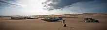 In the late 19th century shipwrecks on Stockton Beach were so common that two tin sheds were constructed on a part of the beach in what is now Bobs Farm near Salt Ash to hold provisions for shipwrecked sailors.[11] During the Great Depression of the 1930s a group of squatters constructed a series of tin shacks at the site which is approximately 11 km (6.8 mi) south west of Anna Bay.[12][13] During World War II the shacks were torn down to make way for an Army camp.[9] Today, eleven of the shacks, known collectively as "Tin City", remain but no new shacks may be built, nor can existing shacks be rebuilt if they are destroyed by the elements.[9] Tin City and the beach's sand dunes were used for several scenes in the 1979 movie Mad Max.[11][12][14][15][16]