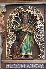 The chancel has a pointed arch and a vaulted Gothic ceiling in six segments. The original Romanesque windows in the nave were first converted into large Gothic windows with pointed arches before being replaced by today's smaller more modern windows which probably date from 1815. The cross on the altar dates from the end of the 15th century and was originally on the chancel arch. The Renaissance pulpit has four shell-shaped niches with figures of the Evangelists flanked by pilasters and covered with pointed arches.[3]