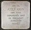 Adolf Kann was born on 6 June 1862 in Litvínov. His parents were Eduard and Julie Kann née Löwy. He was a merchant in Teplice and married Frederika née Freund in 1894. The couple had five children: Grete (born 1896), Erwin (born 1898), Gertrud (born 1901), Edith (born 1905) and Herbert (born 1909).[19][20][21][22] Prior to their deportation, Adolf Kann and his wife were registered in Prague in Böhmova 1329. On 20 July 1942, the couple was deported to Theresienstadt concentration camp with transport AA (his number on the transport was 48). From here he was deported on 22 October 1942, again together with his wife, with transport Bx (his number on this transport was the 1872) to Treblinka extermination camp. Adolf Kann and his wife Bedřiška were murdered in the course of the Shoah.