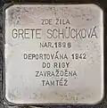 Grete Schücková née Kannová was born in Teplice on 8 April 1896.[38] Her parents were Adolf Kann and Bedřiška (Frederika) Kannová. Grete had four siblings: Erwin, Gerrtud, Edith and Herbert. She married Josef Schück. Prior to deportation, she was registered in Prague. On 30 July 1942, she was deported to Theresienstadt concentration camp with transport AAc (her number on this transport was the 910). On 20 August 1942 she was deported to Riga with transport Bb (her number on the transport was 376). Grete Schücková was murdered by the Nazi regime in the course of the Shoah.[39]