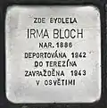Irma Blochová née Löwy was born on 10 November 1886 in Teplice. Her parents were the physician Dr. Moritz Löwy and Flora née Auerbach. She married jurist Ludwig (Ludvík) Bloch. The couple had at least one son and one daughter: Lilly (born in 1913)[5] and Herbert. The last address of the couple before deportation was in Prague in Podskalská 40. On 16 July 1942 Irma Blochová and her husband were deported with transport AAr to Theresienstadt concentration camp. Her transport number was 74. On 6 September 1943 the couple was deported to Auschwitz concentration camp. There both husband and wife were murdered by the Nazi regime.[6][7][8]