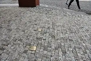 | Stone was removed end of 2014 or beginning of 2015[30] | HERE LIVED RUDOLF PERUTZ BORN 1882 DEPORTED 1942 TO THERESIENSTADT MURDERED IN AUSCHWITZ |