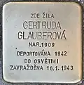 Gertruda Glauberová née Zinner, also called Gertrude or Trude, was born on 24 August 1909 in Hlinsko. Her parents were Ludwig Zinner and Stefanie née Bergmann, also Steffi. She had a sister named Marianna, born on 20 March 1906, later married as Kraus. She married Valtr Glauber (see above). The couple had a son, Karel, born in 1937 (see above). She was arrested, separated from her child and deported to Auschwitz concentration camp. There she was murdered on 16 January 1943.[23][24]