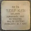 Karel Glauber, also Karl, was born on 14 June 1937 in Horažďovice. His parents were Valtr Glauber and Gertruda née Zinner (see below). On 26 November 1942, the boy was deported from Klatovy to Theresienstadt concentration camp by transport Cd. His transport number was 124 of 651. His mother was deported to Auschwitz concentration camp and murdered there on 16 January 1943. The little boy was deported on 18 December 1943 to Auschwitz by transport Ds. His transport number was 2219 of 2,503. There the Nazis took the life of the six years old boy.[16][17][18]