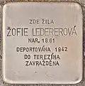 Žofie Ledererová, also called Reisl, was born on 21 June 1861 in Beuthen, Germany. Her parents were Herman and Julie (last and maidens name not known). She was a housewife and married to Vojtěch Lederer. On 26 November 1942, she, her husband and her sister-in-law were deported from Klatovy to Theresienstadt concentration camp by transport Cd. Her transport number was 139 of 651. She lost her life in Theresienstadt on 2 February 1943.[43][44]