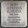 Alexandra Glaserová was born on 11 January 1930. Her parents were Ařnost Glaser and Dr. Irma b. Schwarzová. She had at least one sister, Eva (born 1925). She was a student and was deported to the Łódź Ghetto on 21 October 1941 together with her parents and sister. There the 11-year-old girl was murdered by the Nazi regime, as were his parents.[10][11]
