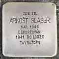 Ařnost Glaser was born on 15 August 1898. His parents were Moric Glaser and Julie b. Pánková. He was self-employed and married Dr. jur. Irma b. Schwarzová. The couple had at least two daughters, Eva and Alexandra (b. 1930). On 21 October 1941, Ařnost Glaser was deported together with his wife and daughters with transport B to the Łódź Ghetto. Their transport numbers were 468, 469 and 471 of 1,003. There, Ařnost Glaser, his wife and their younger daughter were murdered by the Nazi regime.[8][9]
