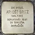 Ařnost Spitz was born on 4 October 1896 in Německý Brod. He was married to Anna b. Picková, the couple had two daughters, Marie (born 1928) and Sonja (born 1931). The last place of residence of the family before deportation was in Prague XIX, Hoferova 3. On 10 December 1941 father, mother and daughter were transported from Prague to the concentration camp Theresienstadt by transport L. Their transport numbers were 295, 296 and 298 of 1,006. There, the family was held captive for almost three years and was finally separated. On 28 September 1944, Ařnost Spitz was deported to Auschwitz concentration camp by Transport Ek. His transport number was 286 out of 1,550. Eight days later, on October 6, 1944, Anna and Sonja Spitzová were deported to Auschwitz. In the end, all three were murdered by the Nazi regime, however the date and exact place of death are only known of Ařnost Spitz: the 18 January 1945 in the Dachau concentration camp.[31][32]