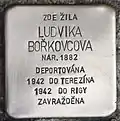 Ludvika Bořkovcová was born on 16 March 1882. Their last place of residence before deportation was in Prague XII, Rollerova 5. On 3 August 1942, she was deported from Prague to Theresienstadt concentration camp by transport AAw. Her transport number was 780 from 1,001. Two and a half weeks later, on 20 August 1942, she was deported to Riga by transport Bb. Their transport number was 708. Of the 1,001 women, men and children of this transport, not one survived. All were murdered by the Nazi regime.[39][40]