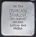 Dr. Milada Šámalová b. Cebeová was born on 11 April in 1906. Her parents were the doctor Jindřich Cebe (1870-1953) and Antonia b. Feyrerová (1874-1953). She completed a doctorate and married the entomologist Jaromír Šámal (see above), son of Přemysl Šámal and Anna Šámalová. She supported her husband in his research and was involved in two of his publications as co-author. The couple had two children, Jiří (1933-1976) and Alena (1937-2003). After the German occupation of the country in March 1939 and the closure of the Czech universities in November 1939, the husband and lawmaker joined the resistance movement. Her father-in-law was arrested in January 1940 and died in March 1941 after the Gestapo imprisonment in Berlin. Her husband was arrested in May 1942 and executed on June 5 in 1942 by the Nazi regime in Prague. Milada Šámalová was arrested and sent to Auschwitz concentration camp, when she wanted to inquire about her husband at the Gestapo. Both children, nine and five years old, were taken into custody by the National Socialists and deported to Łódź Ghetto together with the children from the destroyed village of Lidice. Afterwards, Jiří and Alena were given to a German family for"Germanization". After the end of the Nazi regime the children were found again and entrusted to their uncle for education. The daughter was later called Veselovská because of a marriage.