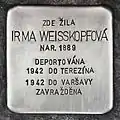Irma Weisskopfovà was born on 20 October 1889. She was married to Karel Weisskopf, the couple had three children. On 18 April 1942 she and her husband were deported from České Budějovice to Theresienstadt concentration camp by transport AK/B, Nr. 820 and 821. Afterwards, on 26 April they were both transferred by transport An, Nr. 967 and 968, to Warsaw ghetto, where they were murdered.[13]