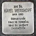 Karel Weisskopf was born on 26 February 1883. He married Irma Weisskopfová, the couple had three children. They made a living with their own distillery which also included a pub. They were later driven out of their house and lost the distillery. On 18 April the married couple were deported from České Budějovice to Theresienstadt concentration camp. On 26 April 1942, Karel and his wife were brought to Warsaw ghetto where they were both murdered.