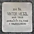 Viktor Metzl was born on 13 January 1903 in Třeboň. He was a lawyer and he married Marie Vlasimska. The couple had two children – Alena (born in 1932) and Nora Metzl (born in 1934). On 4 October 1944 Victor was arrested, and he was murdered on 7 April 1945 in Mauthausen concentration camp. His wife was arrested in December 1944. When the war had finished, she returned home to her daughters.