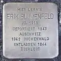 HERE LIVED ERIK BLUMENFELD BORN 1915 DEPORTED 1943 AUSCHWITZ 1943 BUCHENWALD RELEASED 1944 SURVIVED |
