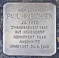 HERE LIVED PAUL HINRICHSEN BORN 1912 FORCED LABOUR 1942 NEUENDORF ESTATE DEPORTED 1943 AUSCHWITZ 1943 BUCHENWALD MURDERED 24.8.1943 |