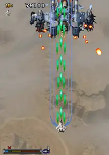 The player chooses from one of six modern jet fighter aircraft and shoots through eight stages (the first four levels are randomly chosen, and the last four remain the same for each play). Once the game is beaten, a report showing the statistics of the player are displayed, and the game 'loops' with the difficulty much higher. Each game (on default settings) begins with three lives, and an extra life is earned at 600,000 (or 800,000). When all lives are lost, the option to continue is given but the score is reset.