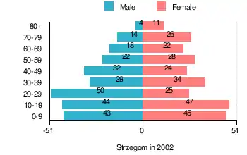 According to the 2002 Poland census, there were 518 people residing in Strzegom village, of whom 49.4% were male and 50.6% were female. In the village, the population was spread out, with 31.1% under the age of 18, 36.9% from 18 to 44, 15.3% from 45 to 64, and 16.8% who were 65 years of age or older.[1]