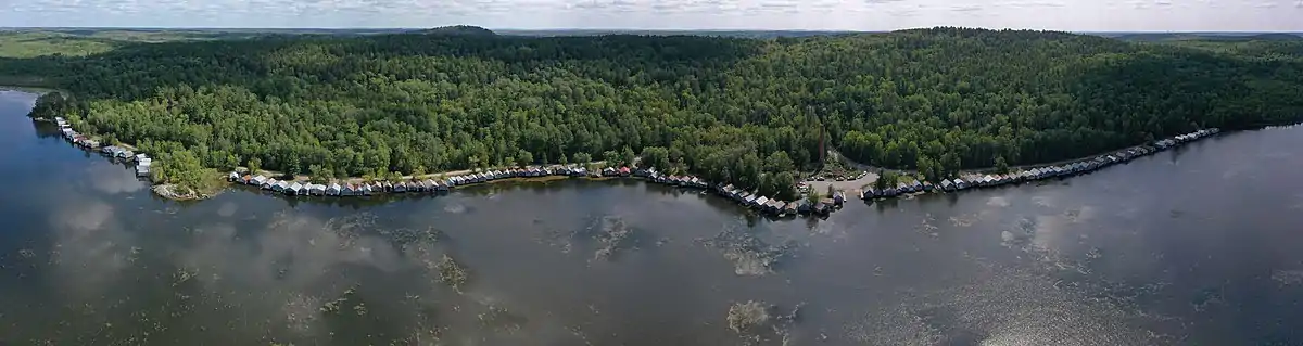 The Stuntz Bay Boathouse Historic District comprises a row of 143 boathouses on Lake Vermilion in Breitung Township, Minnesota, United States. They were mostly built in the first half of the 20th century by employees of the adjacent Soudan Iron Mine. The mining company provided the lots to employees as a reward for their years of service, and the miners did their own construction. Most of the boathouses were built with tamarack logs and scrap corrugated metal from the mine property. Boating and fishing were major pastimes for the mine employees and their families in their leisure hours, and the mining company promoted access to outdoor recreation as a perk of employment.[2] The Stuntz Bay Boathouses were listed as a historic district on the National Register of Historic Places in 2007 for their local significance in the themes of architecture, entertainment/recreation, industry, and social history.[3] They were nominated for illustrating the personal lives of the miners and vernacular metal architecture.[2]
